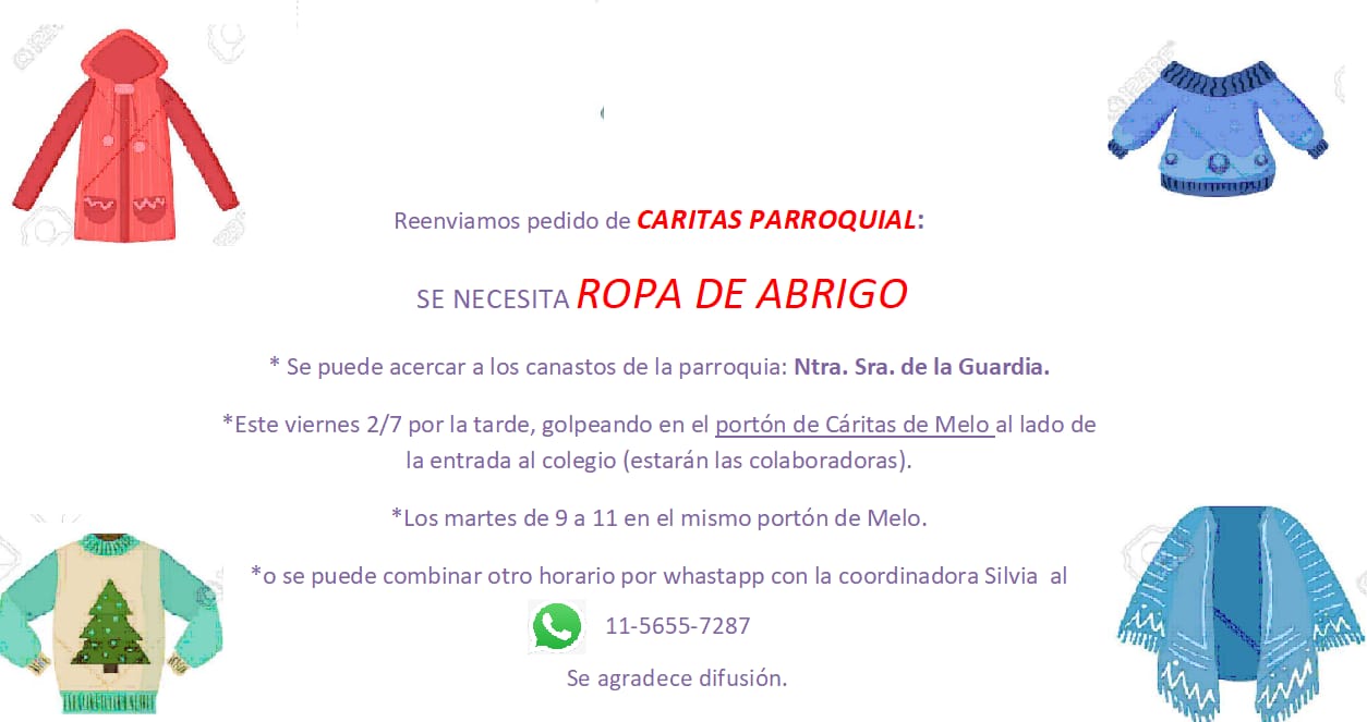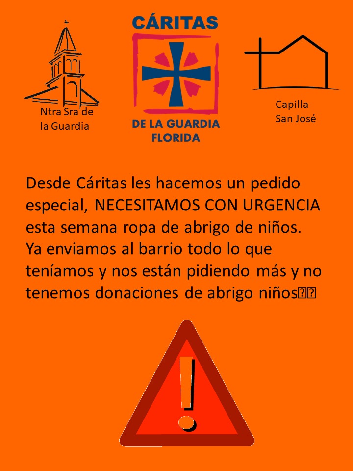 Desde Cáritas les hacemos un pedido especial, necesitamos con urgencia esta semana ropa de abrigo de niños. En Capilla San José, se recibe durante la misa. Luego se lleva a La Guardia.